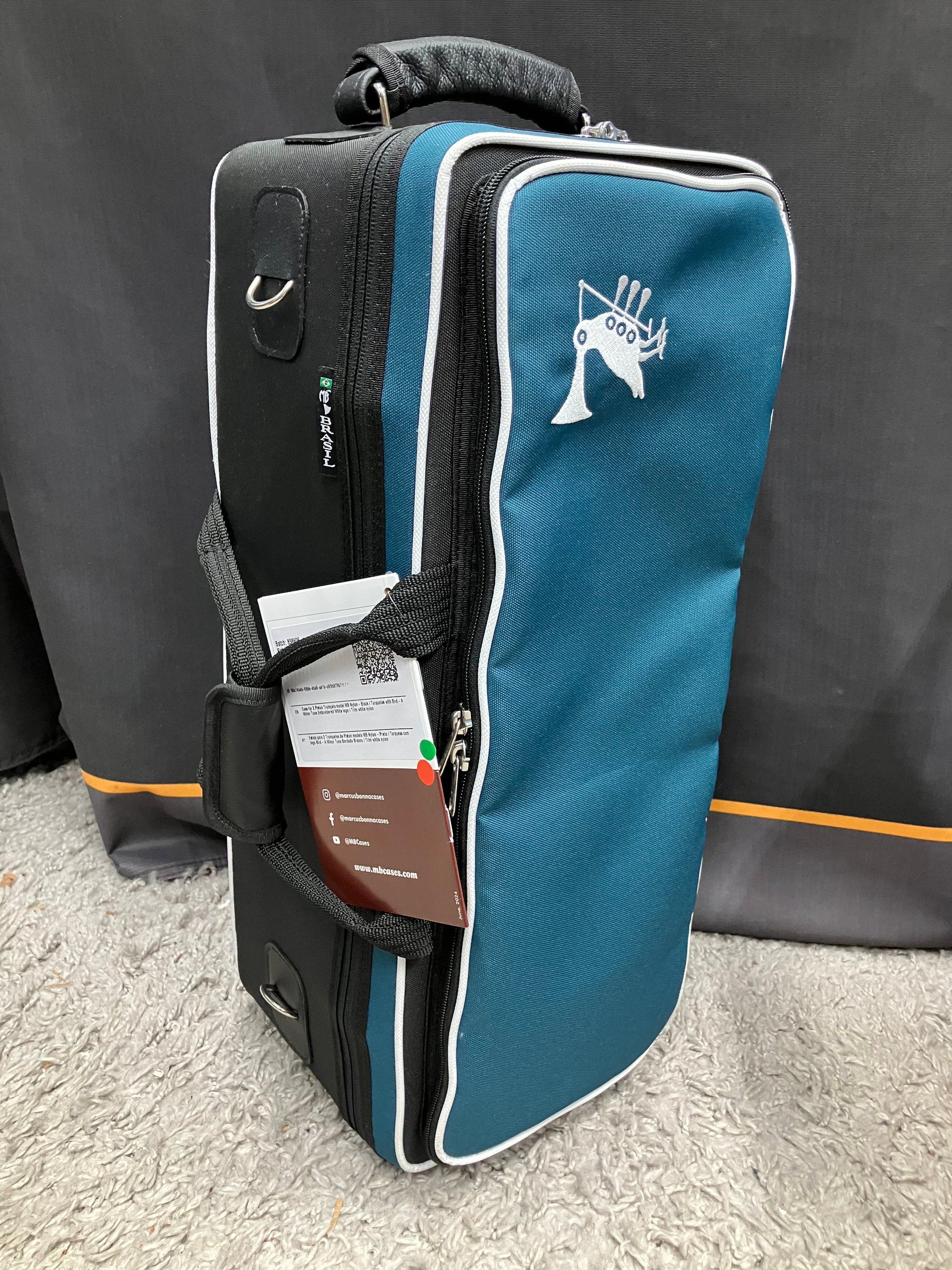 Marcus Bonna case for 2 piston trumpets (will also fit most cornets). This offers a very compact outer footprint, even smaller than most factory wood shell cases. We routinely recommend this for players to act as a single case with room for mutes and accessories.