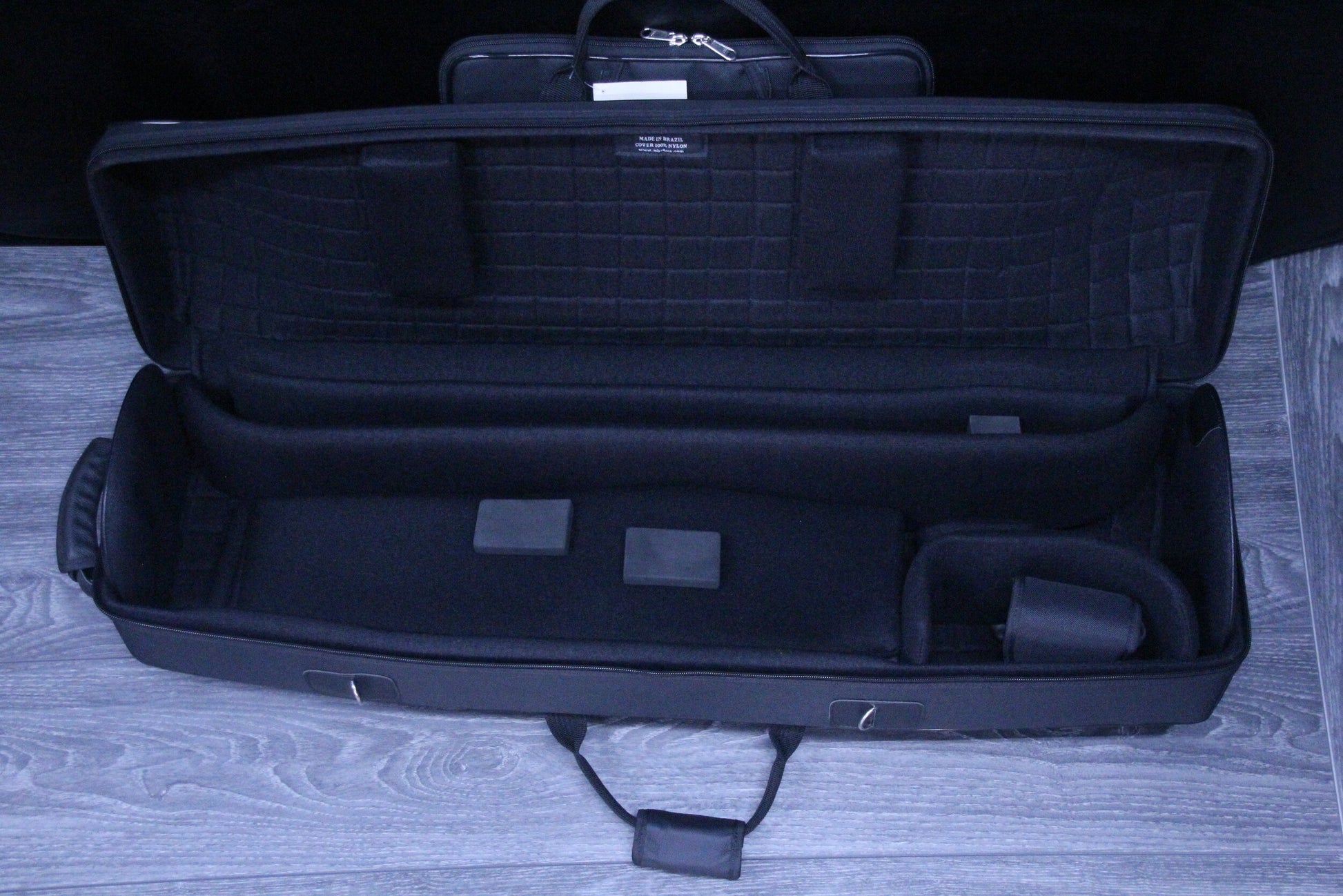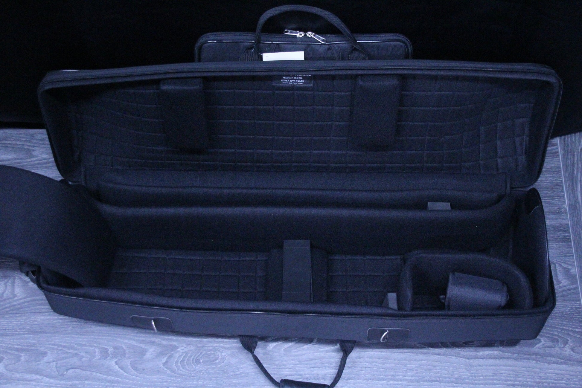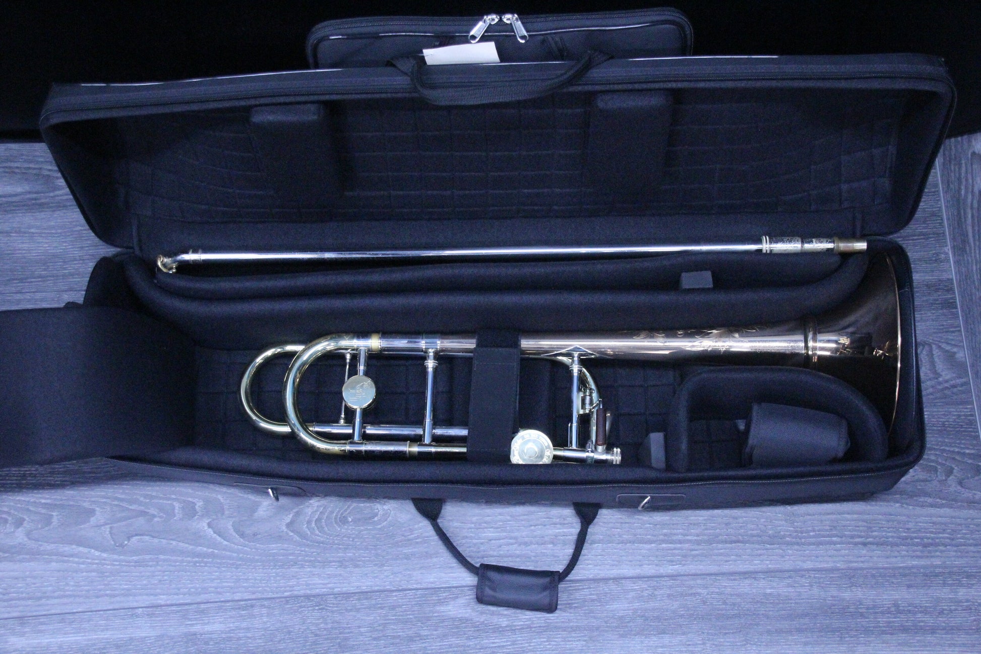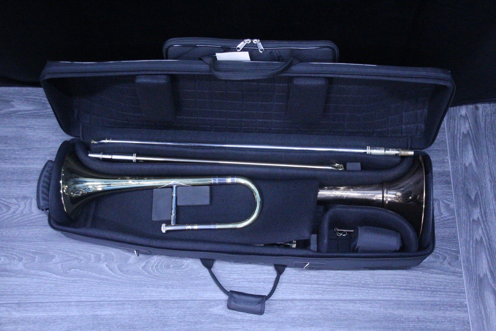 Marcus Bonna double case for 1 tenor and 1 alto trombone. Includes attachable zipper bag for sheet music and trombone stand.