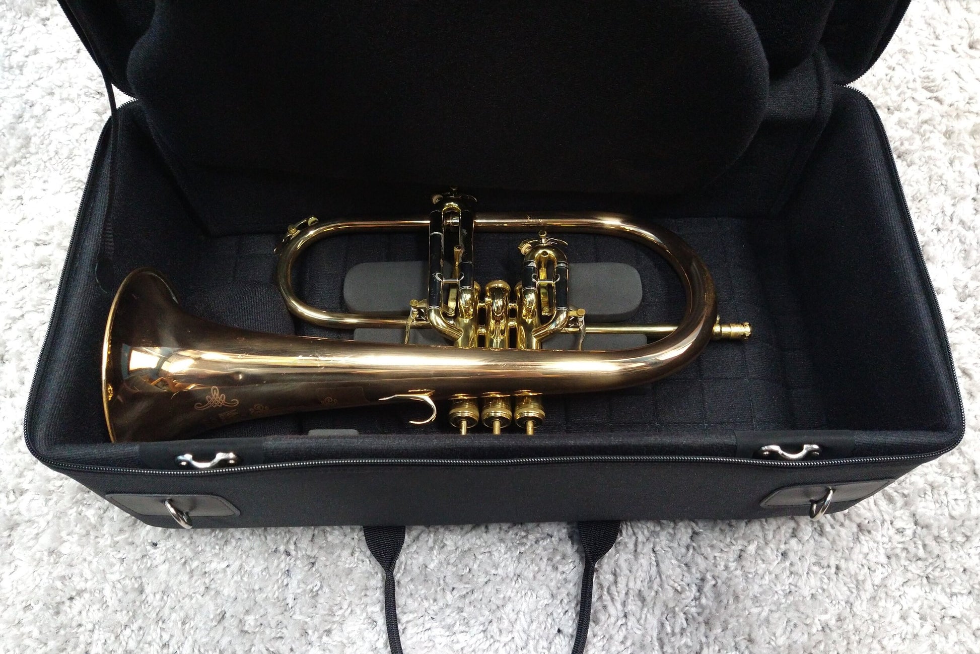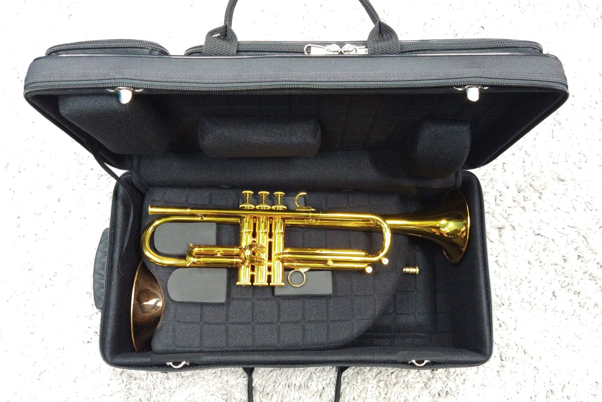 Marcus Bonna double case for 1 piston trumpet and 1 flugelhorn. Internal space for mutes and accessories. External pockets for accessories and sheet music.