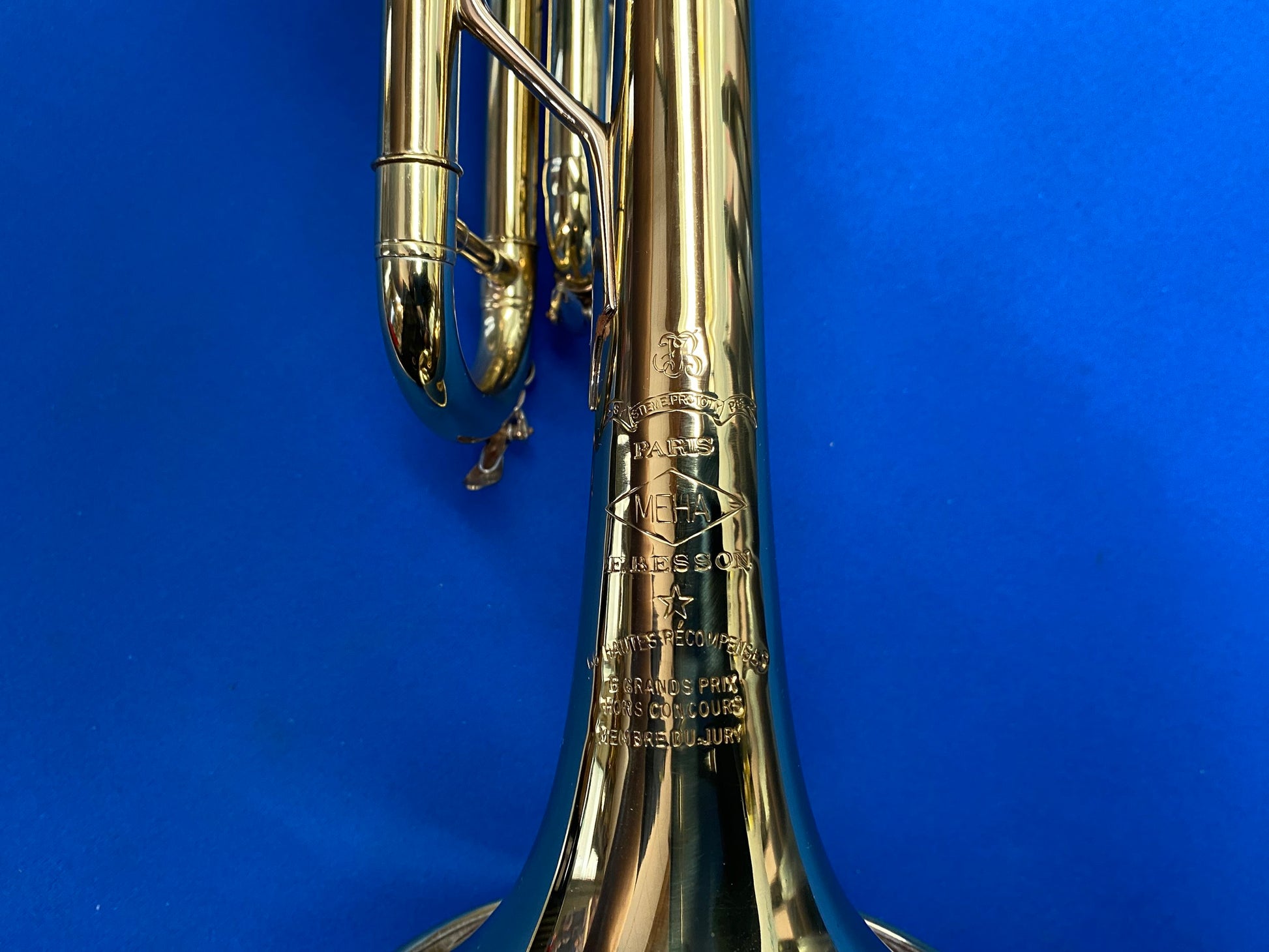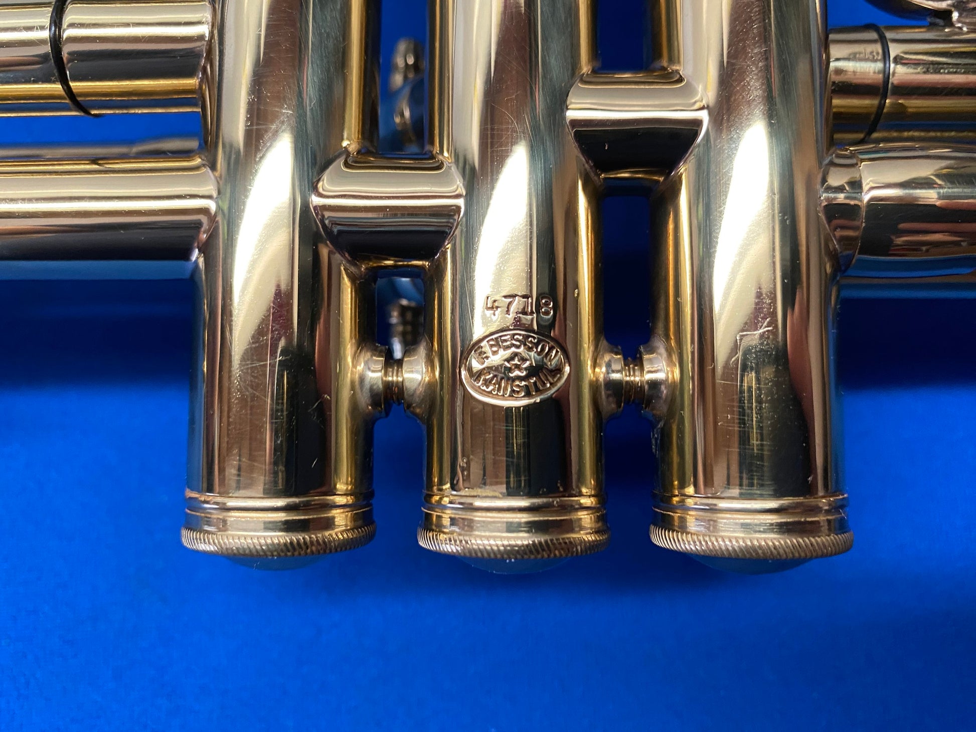This is a Kanstul-made Besson MEHA Bb trumpet. There are some spots of red rot on the lead pipe and the lower branch entering the 3rd valve casing (see pictures). The rest of the horn is in very good condition, and was professionally ultrasonically cleaned and serviced prior to listing it for sale.