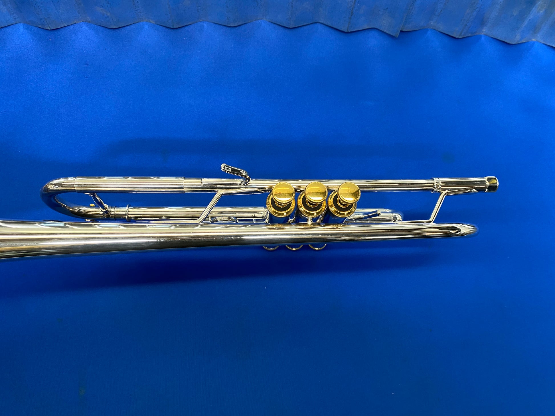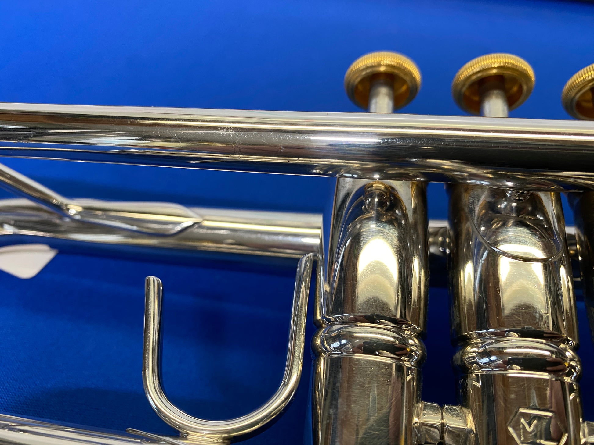This is a USED Stomvi Elite Bb, with a #3 leadpipe and #27 bell. The horn is overall in excellent condition with the exception of it showing early signs of red rot in the leadpipe as evidenced by just a few very minor pits in the plating however there are no holes. There are a few very minor dents, mainly on the 3rd slide crook and bottom bell crook but the horn is otherwise in great condition mechanically, and was professionally ultrasonically cleaned and serviced prior to listing it for sale.